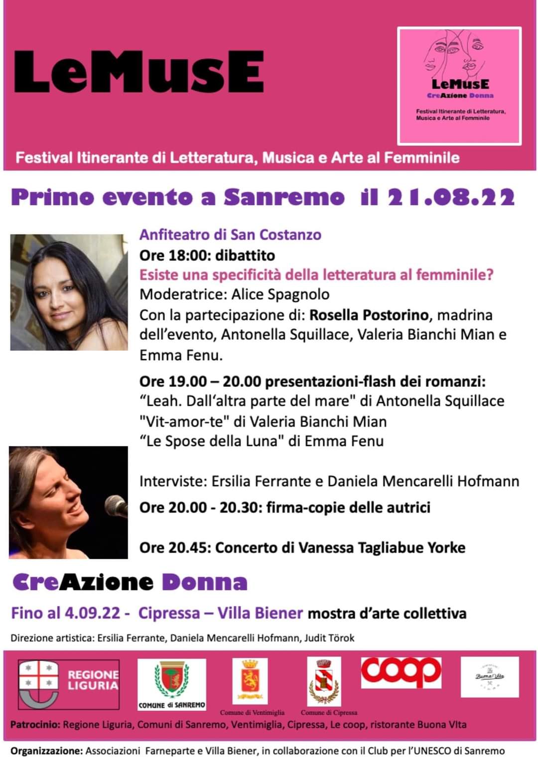 Seguirà il primo evento a Sanremo, domenica 21 agosto alle 18,00 con un dibattito su “Esiste una specificità della letteratura al femminile?”, moderato da Alice Spagnolo, a cui parteciperanno: Rosella Postorino, Emma Fenu, Antonella Squillante e Valeria Bianchi Mian.