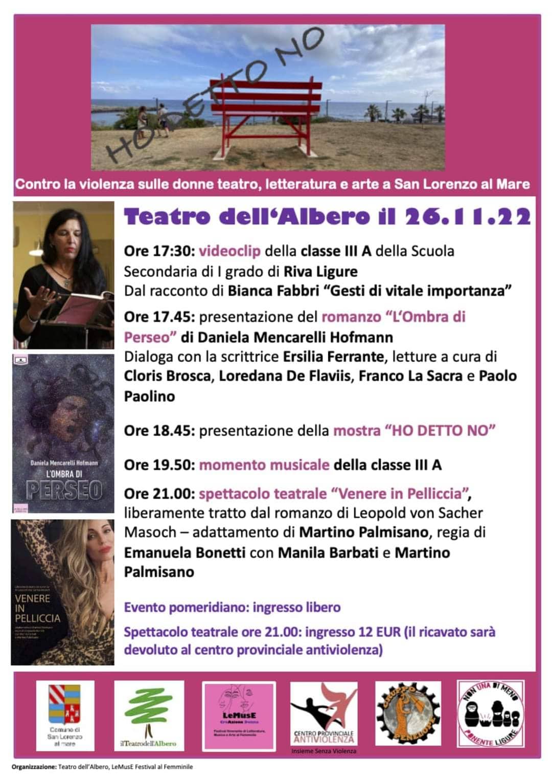 HO DETTO NO. Serata organizzata nel periodo che a livello internazionale è dedicato alle GIORNATE CONTRO LA VIOLENZA VERSO LE DONNE. Una collaborazione del LeMuse Festival al Femminile e Teatro dell’Albero, con PENELOPE e Non Una di Meno Ponente Ligure, con Centro Provinciale Antiviolenza.
