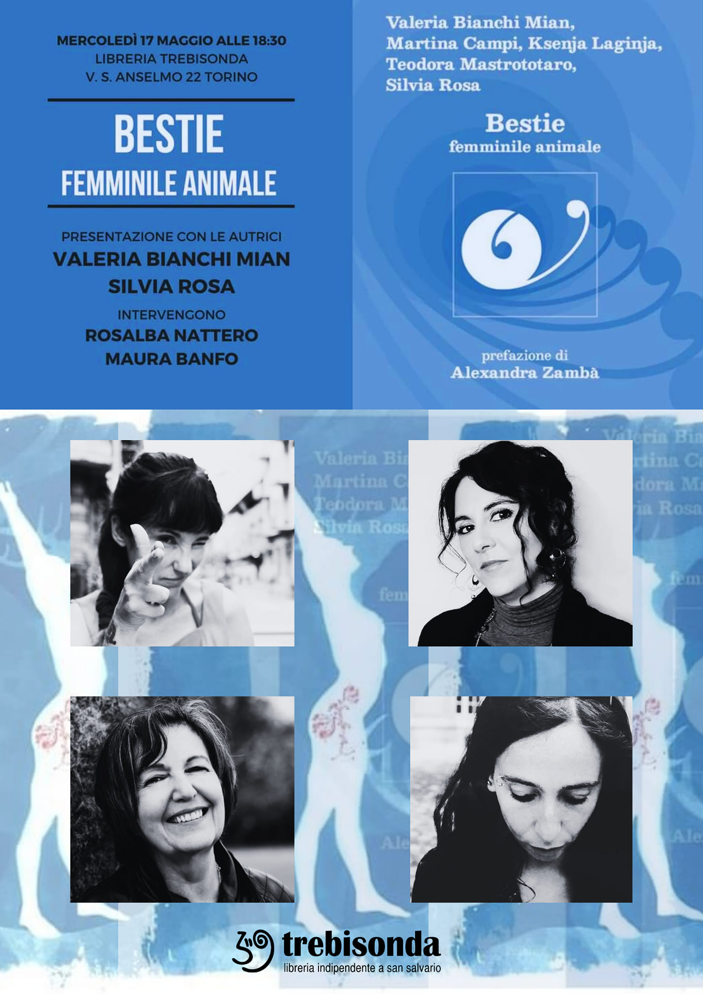 1. Mercoledì 17 Maggio alle ore 18,30: Bestie. Femminile animale, con Valeria Bianchi Mian e Silvia Rosa | conduce Rosalba Nattero | ospite Maura Banfo | #SaloneOff presso Libreria Trebisonda di Malvina Cagna.