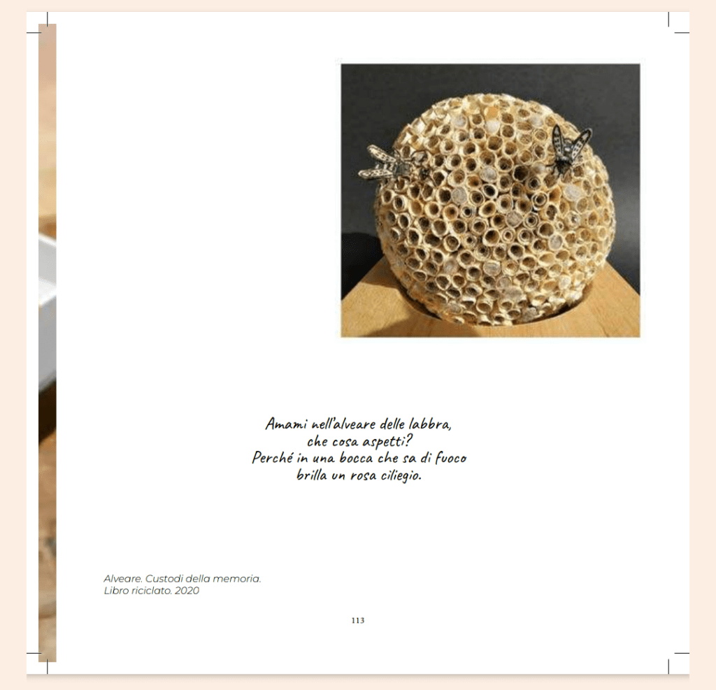 Costruisce le sue cartose opere “Indumenti poetici” con ciò che viene rifiutato, inutilizzato: vecchi libri riciclati, destrutturati e ricreati, talvolta filati, a formare una stoffa di carta che utilizza come metafora poetica, visioni da indossare per descrivere la realtà, anche quella più dolorosa; simboli visivi e archetipi umani che ci accompagnano nel nostro difficile viaggio terreno e spirituale. Strappi come cicatrici, che diventano feritoie da dove la luce ci illumina e custodisce, preparandoci per nuove fioriture.