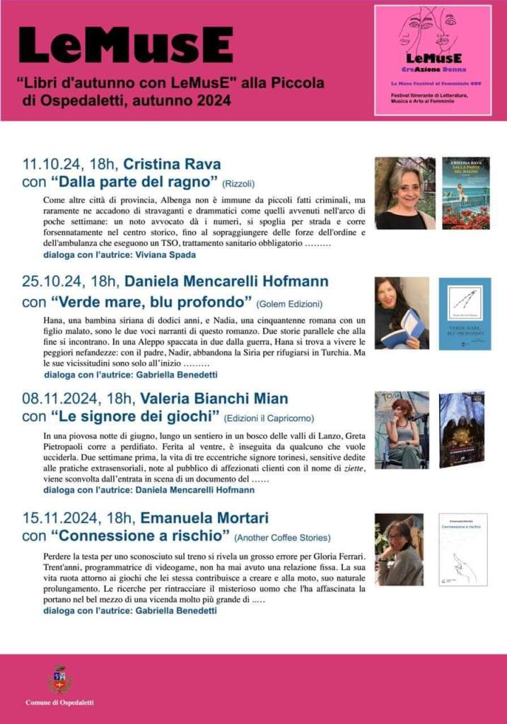 - Dopo il Festival Itinerante di Letteratura, Musica e Arte al Femminile 2024, l’Organizzazione di Volontariato Le MusE prosegue il suo percorso culturale con la rassegna letteraria Libri d’Autunno con Le MusE, che si terrà dall’11 ottobre al 15 novembre, alle ore 18.00, a La Piccola (ex scalo merci) di Ospedaletti.