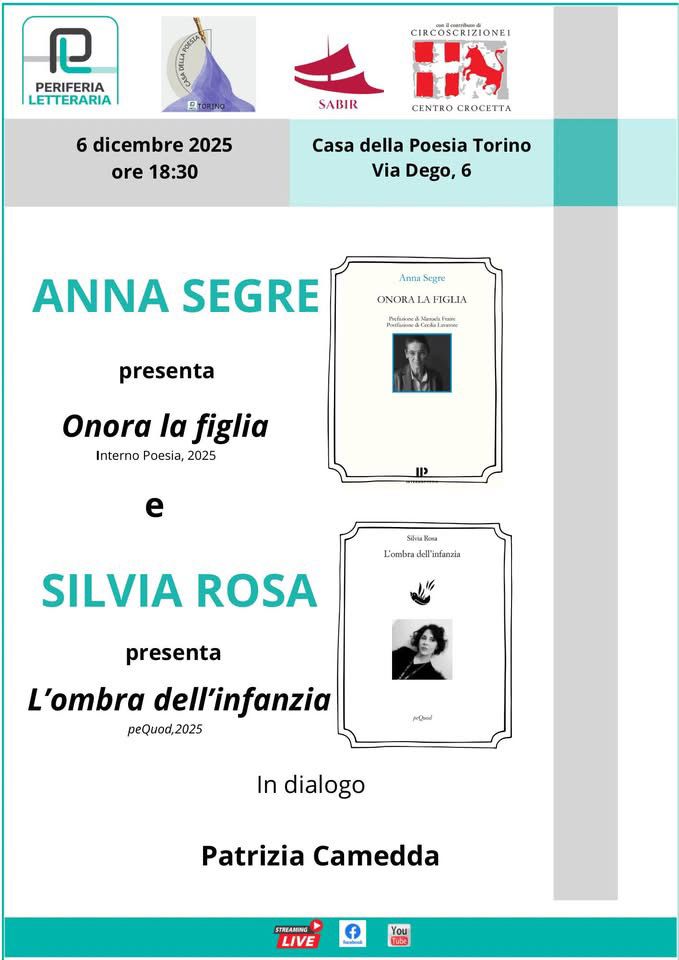 Presentazione: questo sabato, 6 dicembre, alle ore 18,30 presso la Casa della Poesia di Torino, in via Dego 6. Periferia Letteraria, con Silvia Rosa e Anna Segre. Presenta Patrizia Camedda.